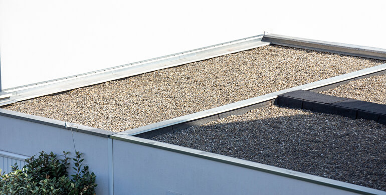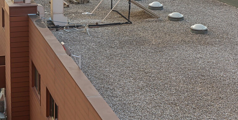 A gravel-surfaced built-up roof uses multiple layers of roofing felts set in hot asphalt, finished with aggregate to protect the membrane. The gravel shields the roofing system from UV exposure and increases durability in high-traffic areas common in commercial roofing. The gravel provides added grip in accident-prone areas, such as around equipment and walkways.
