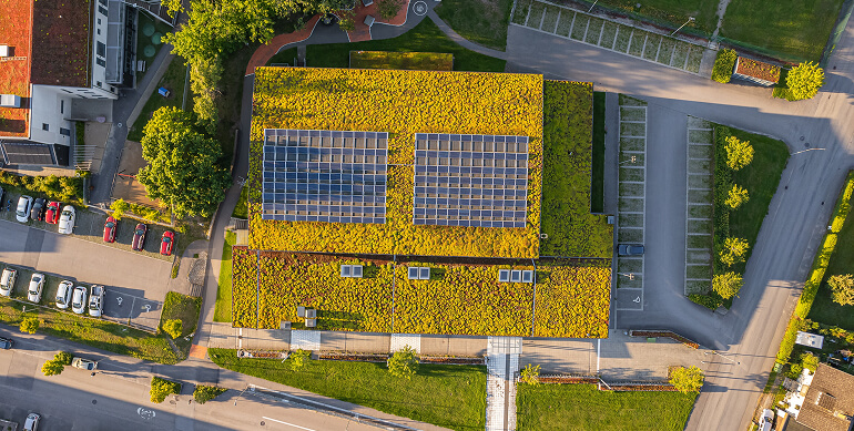 Yes. Many green roof systems integrate solar panels for added energy efficiency.